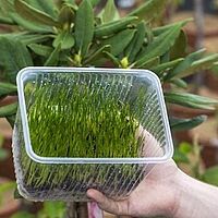 - Retire o bloco de cereais da embalagem e coloque-o num bloco de lã de rocha húmido de 2-3 litros. Recomenda-se usar um vaso suspenso de 20 cm de diâmetro.