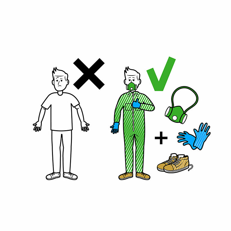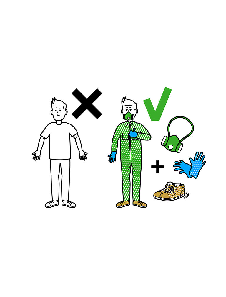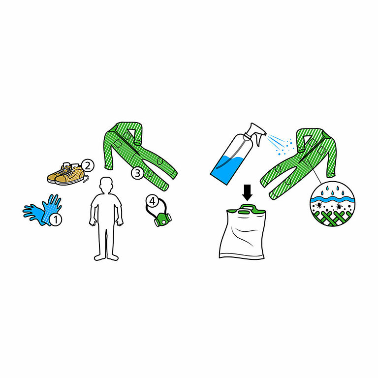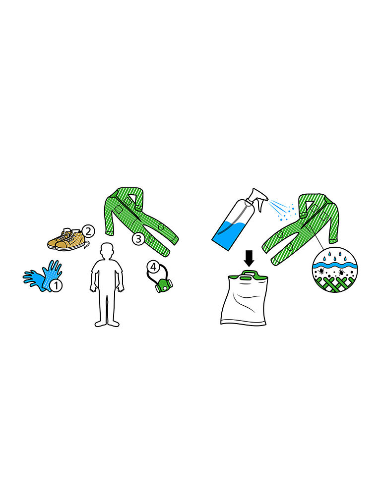 Depois de terminar o seu trabalho, retire as luvas, sapatos e roupa antes de retirar a máscara. Se possível, lave a roupa e os sapatos no seu local de trabalho e não os leve para casa para evitar que os alergénios e outras partículas se espalhem. Se lavar a roupa em casa, humedeça-a no trabalho e leve-a para casa num saco de plástico fechado. A humidificação da roupa no saco evita que os alergénios e outras partículas se dispersem no ar ao abrir o saco.