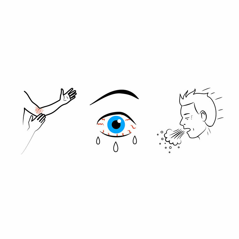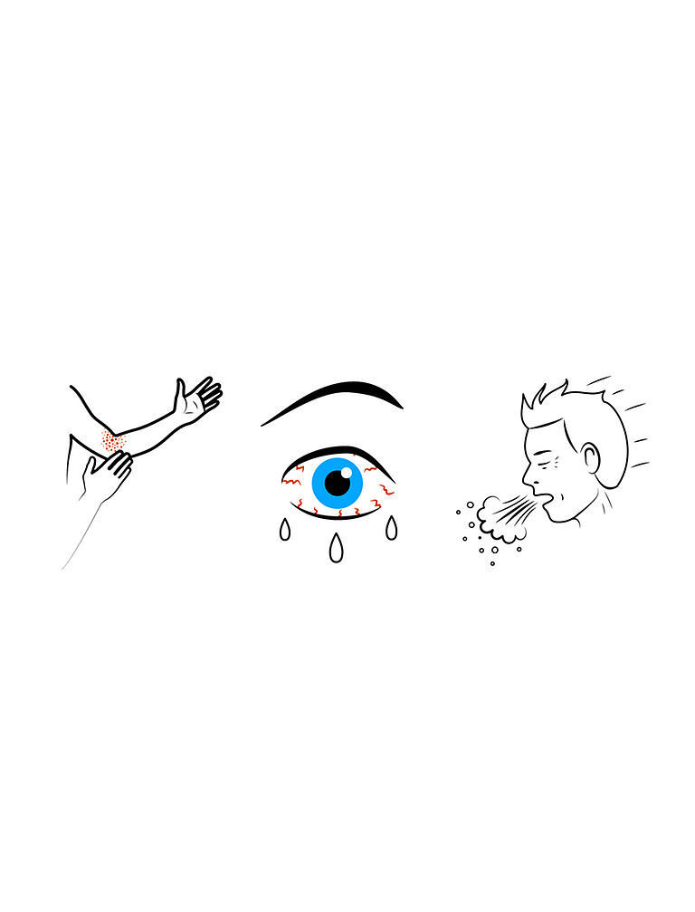 Contudo, caso entre em contato com as substâncias dos produtos mencionados acima e se você for alérgico, é possível que apresente sintomas cutâneos (pele vermelha com prurido ou eczema alérgico), no nariz (espirros, secreção ou prurido) ou nos olhos (prurido ou lacrimejamento).