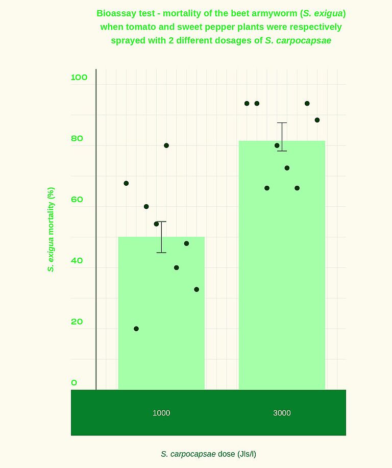 Os departamentos de I&D de vários locais da Koppert têm vindo a investigar aplicações foliares dos nossos nemátodos há vários anos. A experiência de laboratório e de campo mostra que o Entonem e o Capsanem são significativamente eficazes contra uma variedade de lagartas. Também mostra que, embora os nemátodos se movam mais eficientemente numa camada líquida, uma superfície de folha seca não impede os nemátodos. Dependendo das condições climáticas, os nemátodos sobrevivem na superfície da folha durante muitas horas ou vários dias.