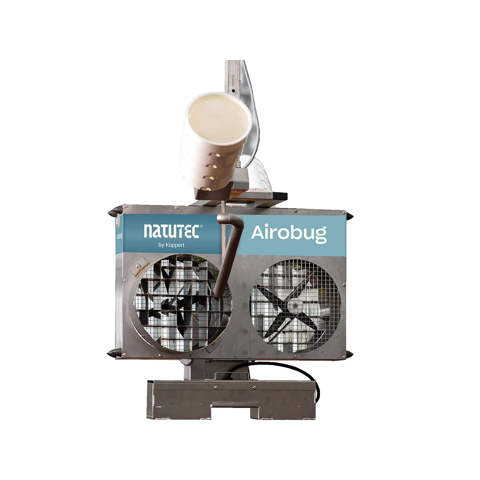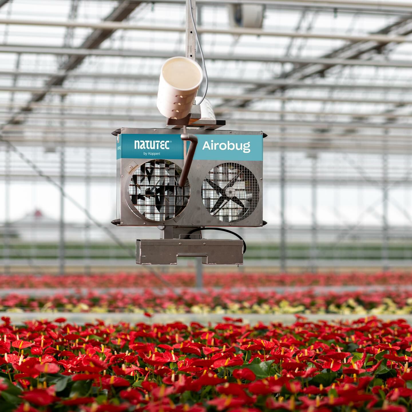 Utilizar o Natutec Airobug para a distribuição de inimigos naturais na cultura. O Airobug pode ser utilizado para grandes superfícies e para a distribuição em todo o campo em estufas de alta tecnologia com sistemas de transporte interno.