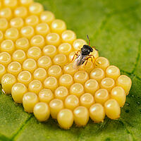As vespas parasitas adultas de Trissolcus basalis põem um ovo num ovo hospedeiro. As larvas desenvolvem-se no interior do ovo hospedeiro e, após a pupação, o adulto emerge do ovo hospedeiro mordendo um orifício na tampa do ovo do percevejo.