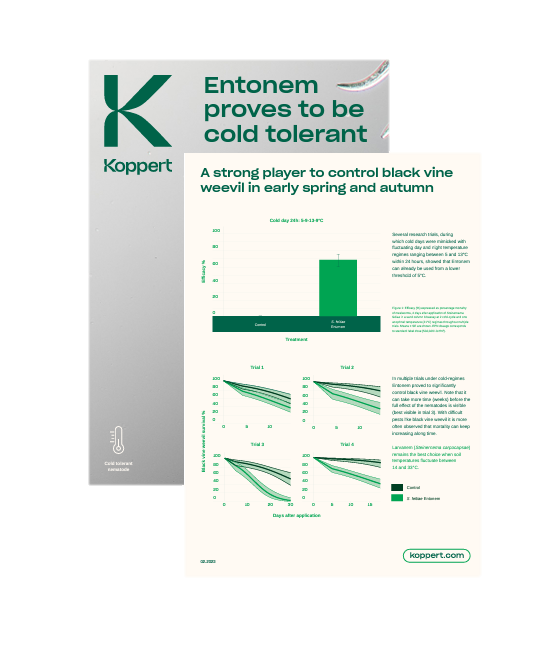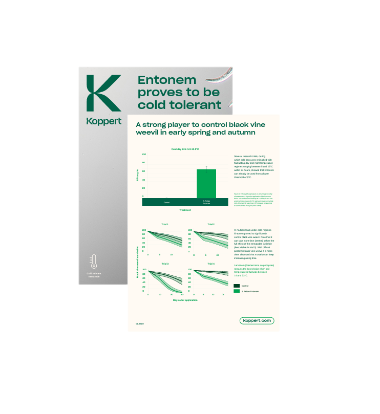 A luta biológica contra o gorgulho da vinha preta(Otiorhynchus spp.) deve começar no início da estação para obter bons resultados. Esta é a única forma de manter a pressão a um nível aceitável durante a estação de crescimento. Os nemátodos benéficos do nosso produto Entonem são tolerantes ao frio e já podem ser utilizados a partir de 5 °C, quando as temperaturas diurnas e nocturnas oscilam entre 5 e 13 °C (ou mais).