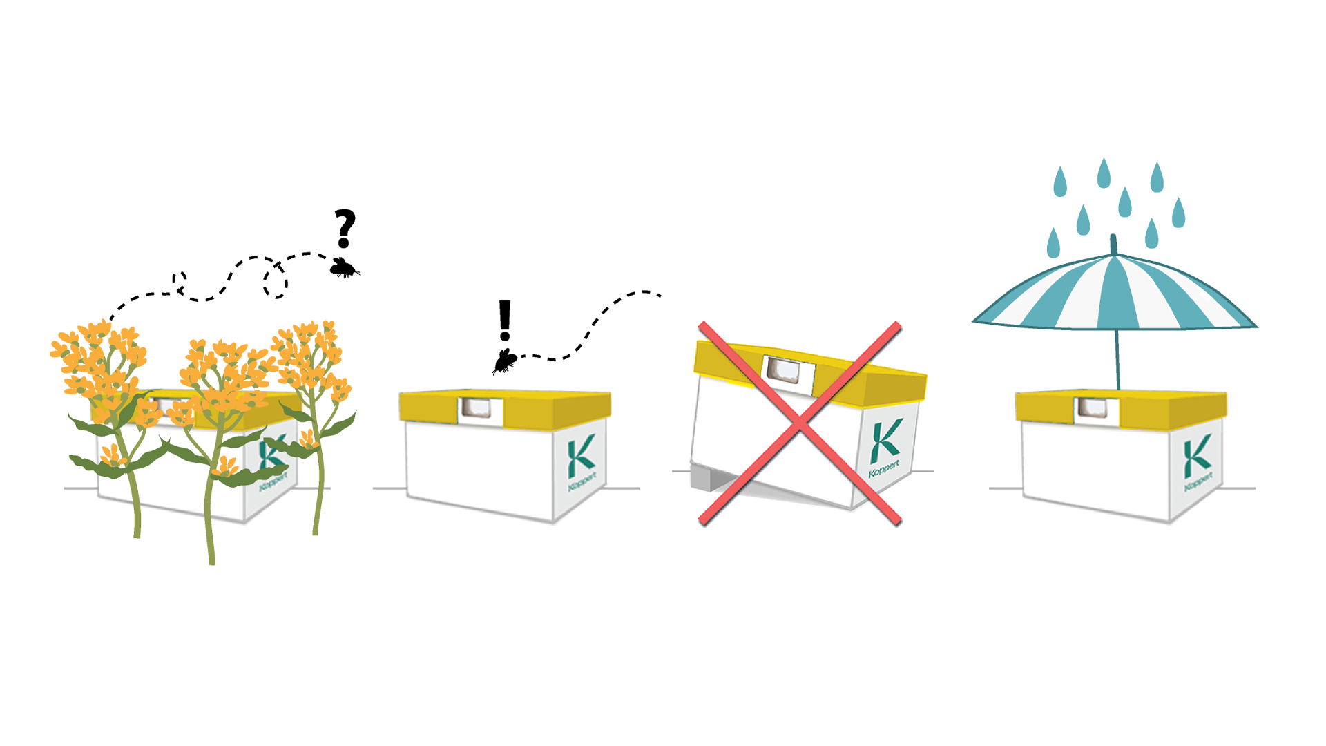 Para um melhor desempenho, é preferível evitar agrupar mais de duas colmeias. Se as colmeias forem colocadas na vertical (não recomendado), os pontos de saída das colmeias devem estar orientados em direcções diferentes, longe da cultura. Para a colocação horizontal, as entradas podem estar na mesma direção, mas afastadas da cultura, com um máximo de duas colmeias agrupadas.