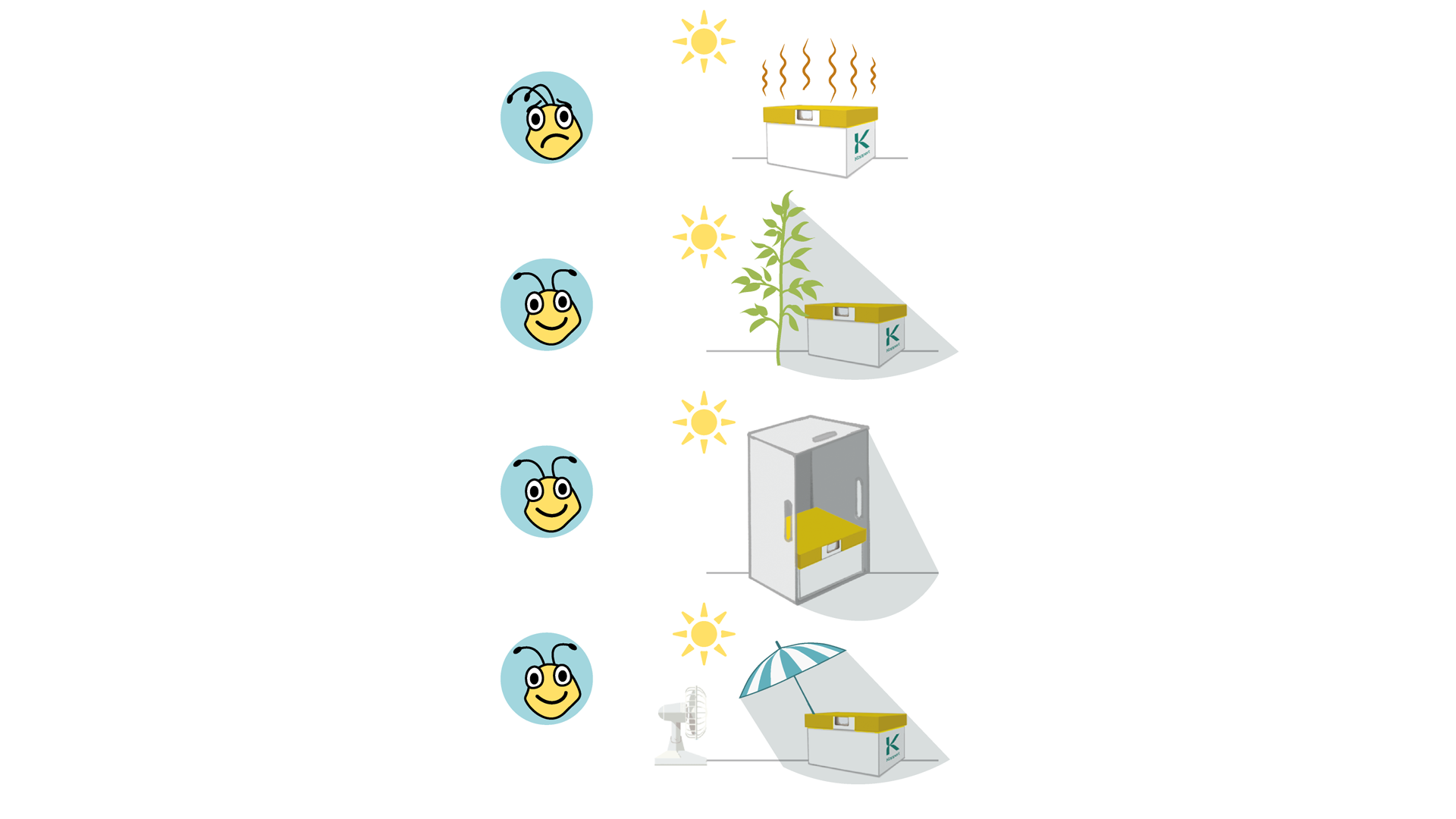 Durante estas estações, é aconselhável colocar as colmeias a uma altura de 20 a 60 cm acima do solo, no lado sul do caminho. Esta localização garante que as colmeias recebem sombra suficiente durante todo o dia. Se a sombra for insuficiente, devem ser tomadas medidas suplementares, nomeadamente no outono, quando o sistema Wireless Beehome estiver fechado. Em caso de temperaturas elevadas, proteja os seus abelhões do calor.