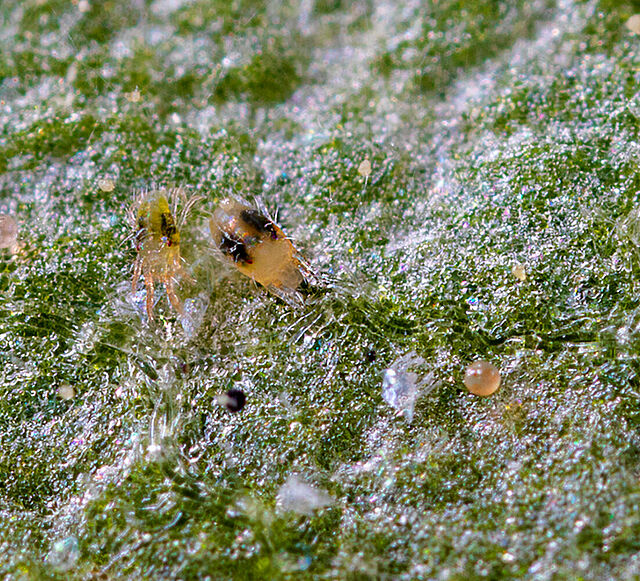 - Ácaro-Aranha (família Tetranychidae): Ácaro Da Aranha De Duas Manchas(Tetranychus urticae) por vezes também chamado Ácaro Da Aranha De Carmine(Tetranychus cinnabarinus), Ácaro Vermelho Europeu(Panonychus ulmi)