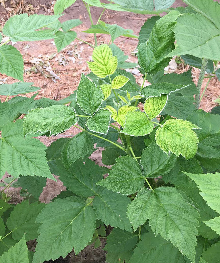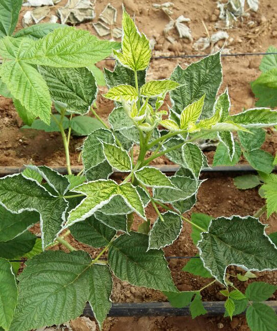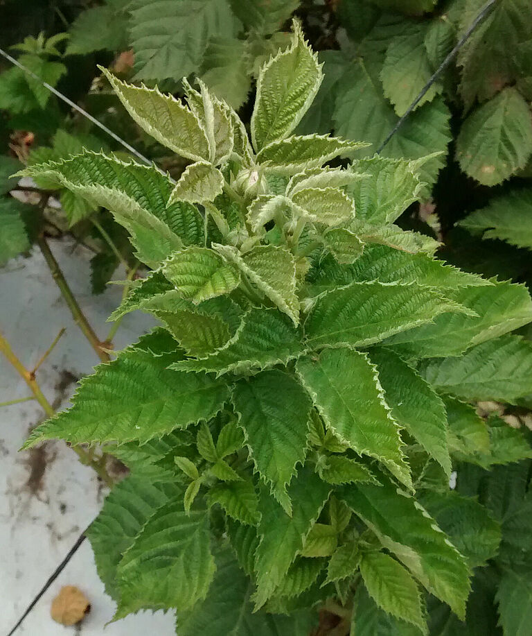 A alimentação à base de folhas se concentra sobretudo na parte inferior da folha, perto do caule, causando o escurecimento e enrolamento da folha. Um sinal típico de ataque do ácaro-branco (Polyphagotarsonemus latus) é o aspecto castanho-escuro nas extremidades das folhas jovens. Se a infestação for moderada, podemos observar manchas ou linhas na cor castanha formando uma fina rede nas folhas. Se a infestação for mais severa, esta rede se torna tão densa que o tecido verde já não fica mais visível. Na maioria dos casos, as nervuras principais ficam intactas, contrastando o verde padrão com o tecido castanho das folhas. As manchas castanhas com aspecto de cortiça podem surgir nos pecíolos das folhas e nas hastes principais.