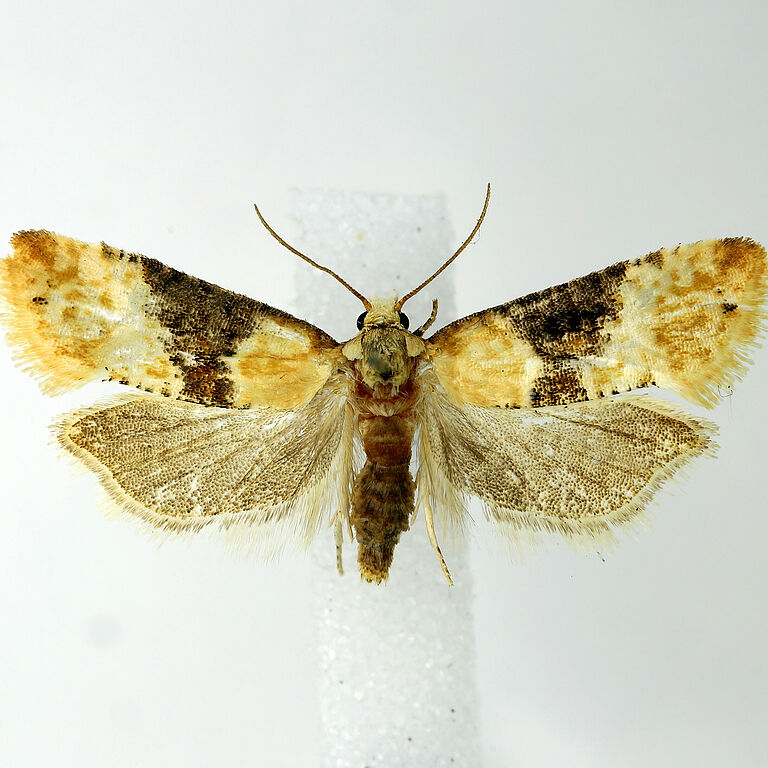 Os adultos têm uma envergadura de 12-15 mm e asas anteriores ocre-esbranquiçadas marcadas com ocre-amarelado e uma faixa escura, acastanhada a preta, no meio das asas anteriores. As asas posteriores são cinzentas. Os ovos têm 0,8 x 0,6 mm e são castanhos acinzentados aquando da postura. Mais tarde, tornam-se salpicados de cor de laranja. As larvas têm até 12 mm de comprimento; corpo castanho-rosado ou castanho-amarelado a verde-azeitona e uma cabeça castanha ou preta. As pupas têm 5-8 mm de comprimento e são castanhas avermelhadas.