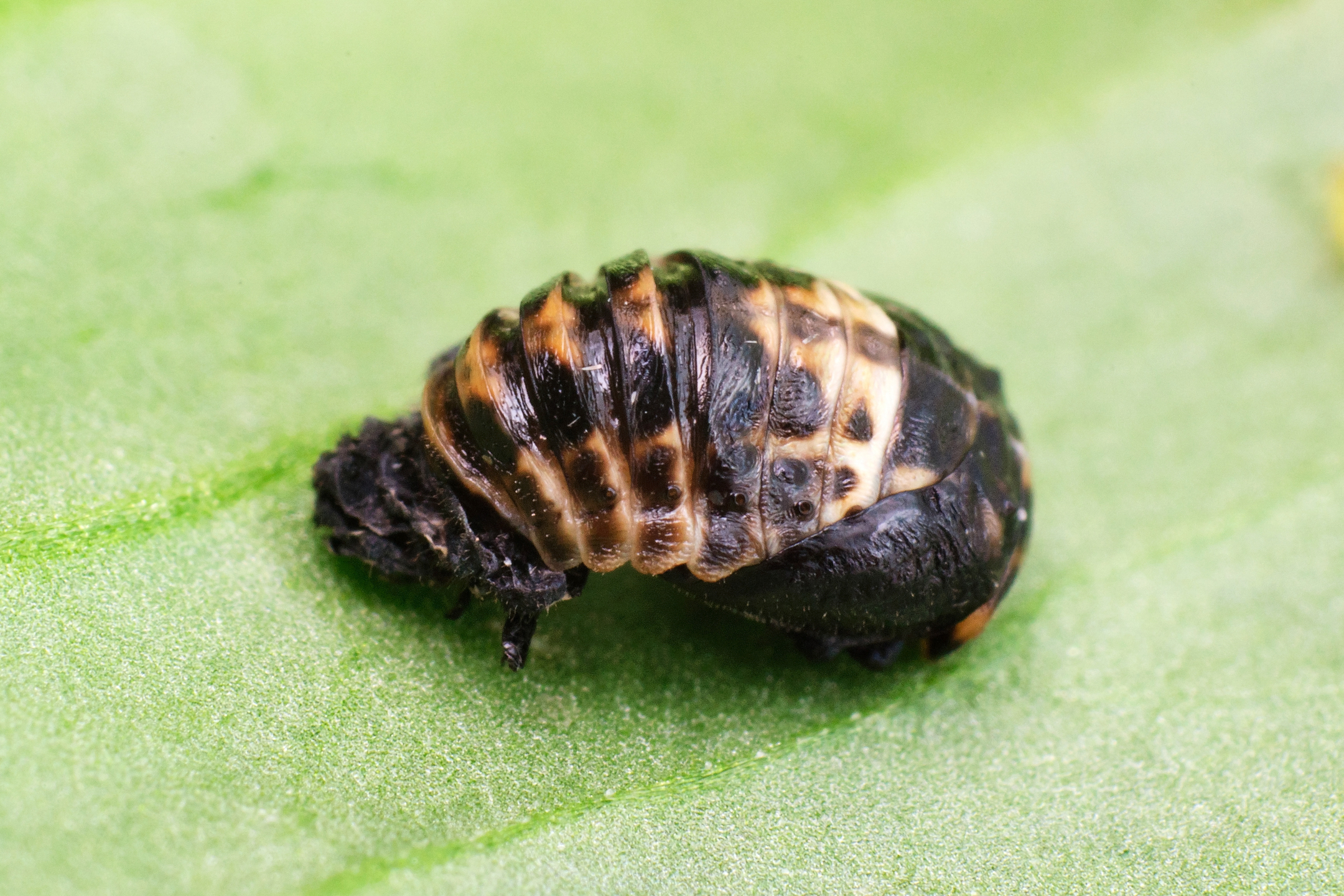 Fase de pupa: As pupas deAdalia bipunctata são estacionárias e assemelham-se a pequenas formas ovais alongadas. A sua cor pode variar entre o amarelo pálido e o castanho claro, dependendo das condições ambientais. As pupas encontram-se frequentemente agarradas às superfícies das plantas ou escondidas em locais abrigados.