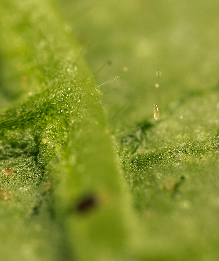 Estágio Do Ovo: As fêmeas de Feltiella acarisuga depositam os seus ovos nas folhas e nas teias dentro e à volta das colónias de ácaro-aranha. Os ovos são frequentemente depositados perto das nervuras das folhas. São transparentes a amarelo claro, ligeiramente mais compridos do que o diâmetro dos ovos do ácaro-aranha e quase em forma de banana.